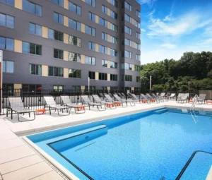 The Vine Apartments in Hoboken, New Jersey elevated its resident amenity package in 2014 with a 442 square foot rooftop leisure pool designed by Wallover Architects. In Hoboken’s fiercely competitive rental market—where proximity to Manhattan attracts young professionals with exacting standards—this rooftop pool delivers the lifestyle differentiation that transforms casual apartment shoppers into committed residents.